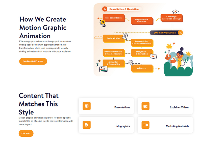 | 1 | F.Learning Studio | –End-to-End 2D Motion Graphics -Production: Complete service from concept to final, engaging 2D animation videos. – Basic & Complex 2D Motion Graphics: Shape and image-based animations for data visualization, system explanations, and tech/SaaS videos, budget-friendly and brandable. Click to check the example. –Character-Based 2D Animation: Storytelling and emotional videos with custom character creation, ideal for training and business communication. Click to check the example. – Diverse Animation Style Library: Tailored, custom 2D animation styles to fit any need and budget, avoiding templates. – Motion Graphics for Multiple Formats: Expertise in presentations, explainers, infographics, and marketing materials. – Integrated Service Suite: Voiceover, translation, music, and sound effects to enhance 2D motion graphics. – 2D Style Free Consultation: Expert guidance to choose the best animation style for project goals. | – Cost-Effective (Starting at $700/min): High-quality 2D motion graphics studio production offered at competitive and accessible pricing. – 9+ Years Expertise: A highly experienced team dedicated to and specialized in creating compelling 2D motion graphics animations. – Experts in Simplifying Complex Topics with 2D Animation: Proven ability to transform intricate subjects into easily understandable and engaging 2D motion graphic visuals. – High-Volume Production & Reliable Delivery: Consistent output of 80+ minutes of 2D animation monthly, ensuring projects are completed reliably and on schedule. – Global 2D Motion Graphics Portfolio & Client Success: Trusted by a wide range of clients across 15+ countries for their 2D motion graphics needs, demonstrating global reach and satisfaction. |