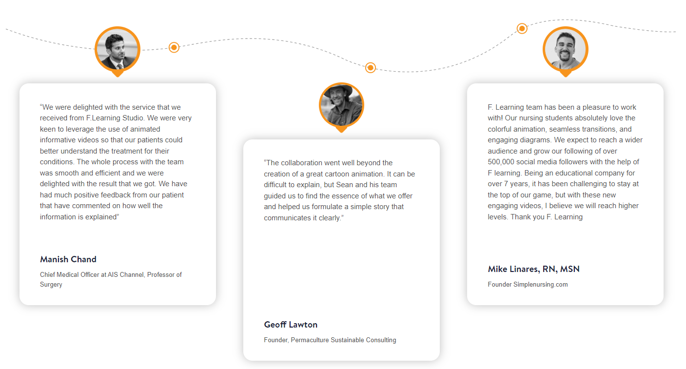Animation is our strength and passion. Being an expert in the field, F. Learning Studio specializes in different types of animation, including whiteboard animation, motion graphics, and frame-by-frame animation. These styles are tailored to meet specific needs in industries like eLearning, corporate training, healthcare, and branding.