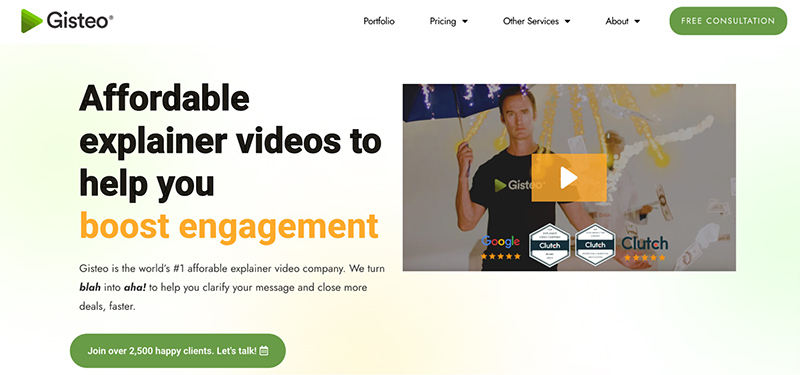 | 3. Gisteo | Produces explainer videos that help businesses clarify their offerings and drive growth, blending expert scriptwriting and production with straightforward processes | 2D animation, motion graphics, kinetic typography, whiteboard videos |