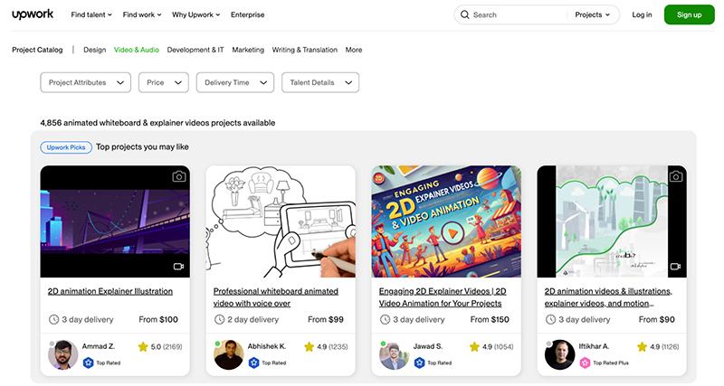 For businesses seeking more customization than template-based solutions offer, yet still aiming to keep costs down, hiring a freelancer is worth considering. Platforms like Fiverr and Upwork provide access to a wide range of freelancers specializing in various aspects of animated explainer video creation, with services starting from as little as $90.