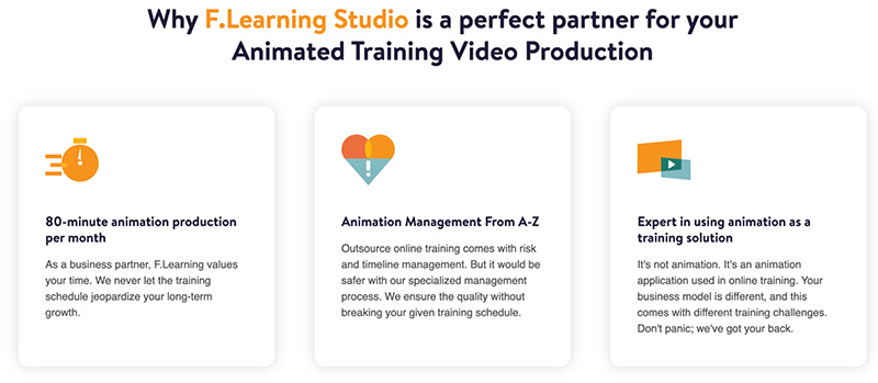 | F. Learning Studio | Specializes in animated corporate training videos using learning design to create engaging and effective learning experiences. | – Interactive onboarding video – Product knowledge video – Soft skill development video – Process & procedure training video – Social media video |