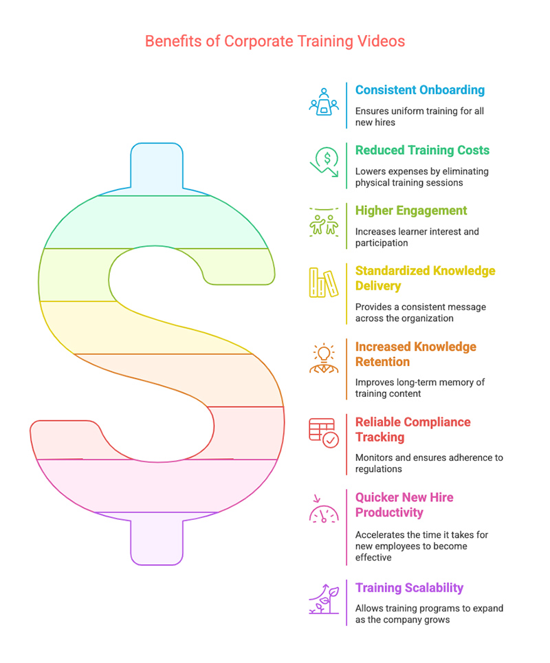 Before choosing a production partner, it’s critical to understand why corporate training videos are more than just a polished alternative to PowerPoint. Here are the core benefits of investing in training videos—and how they directly impact productivity, retention, and ROI.