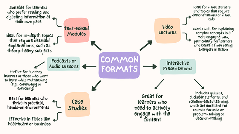 Choosing the right format for your course is key to effectively delivering the content. Depending on your eLearning course objectives and audience, different formats can cater to various learning styles and preferences. Here are some common formats and when to use them:
