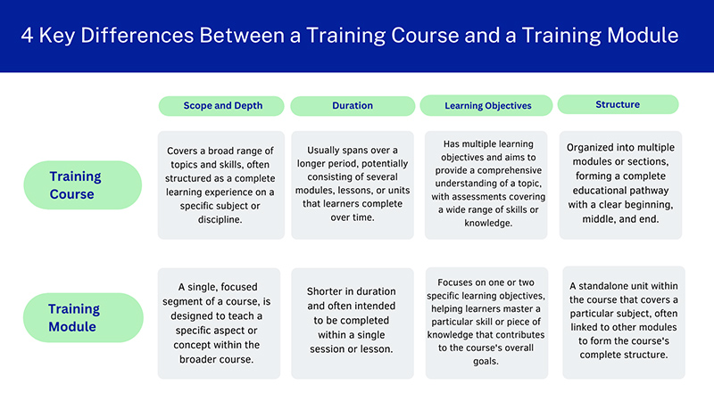 When it comes to designing effective educational programs, it’s essential to understand the distinctions between a training course and a training module. Each plays a unique role in the learning process, and recognizing their differences can help you structure your content more effectively.