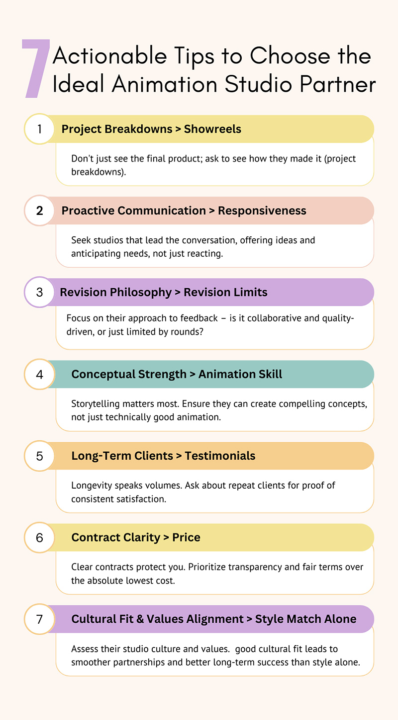 Choosing the right animation studio isn’t just about pretty pictures – it’s about strategic partnership. Here are 6 actionable tips to guide you to your ideal animation collaborator:
