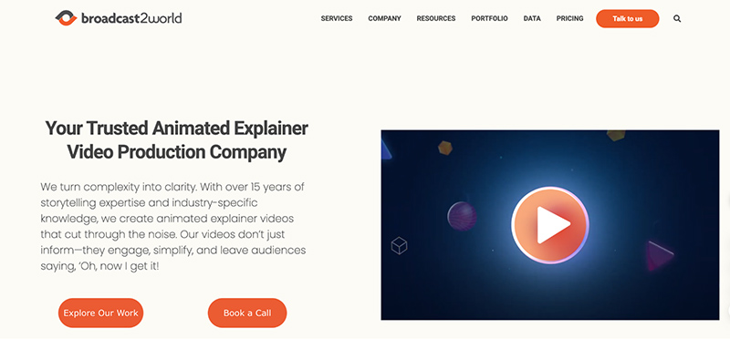 | Broadcast2World | A leading animated explainer video company with over 15 years of experience, creating high-quality videos for global clients in various industries. | Character Animation, 3D Animation, Whiteboard Videos, Infographic Animation, Mixed Media Videos |