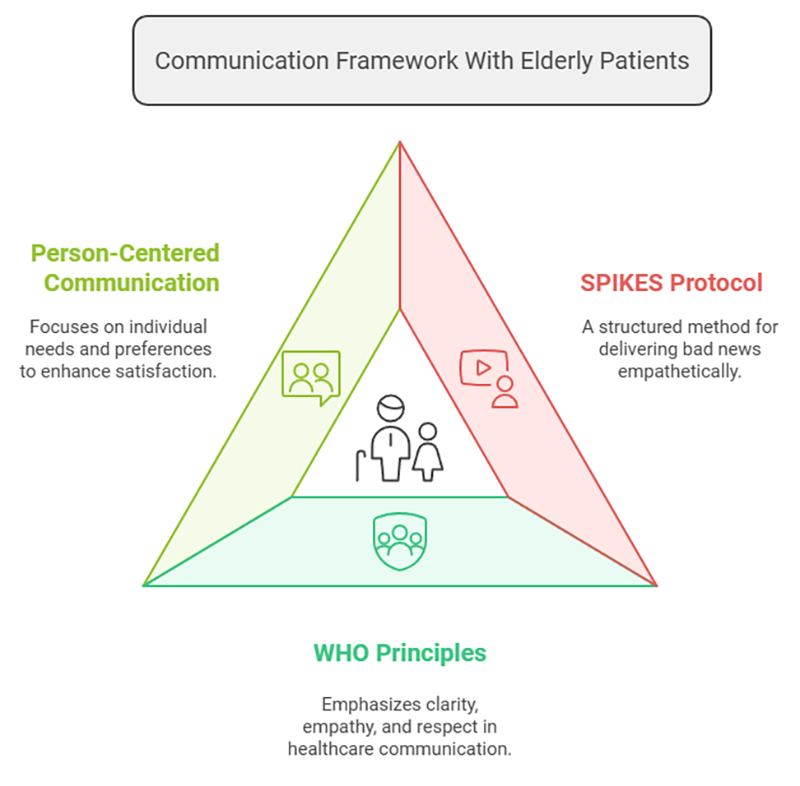 | Patient-Centered Communication | Focuses on the individual needs, preferences, and values of elderly patients to enhance their engagement and satisfaction. | – Build rapport: Establish a trusting relationship by actively listening and showing empathy. – Tailor communication: Adapt your language and approach based on the patient’s cognitive abilities and emotional state. – Involve family members: Engage caregivers or family in discussions to ensure that the patient’s support system is included in care decisions. – Encourage feedback: Ask open-ended questions to understand the patient’s concerns and preferences. |