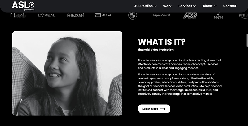 | 10. ASL Productions | A full-service video production company combining knowledge in financial services video creation with an in-depth comprehension of the financial sector. | Financial explainer videos, client testimonials, company profiles, educational videos, and promotional videos |