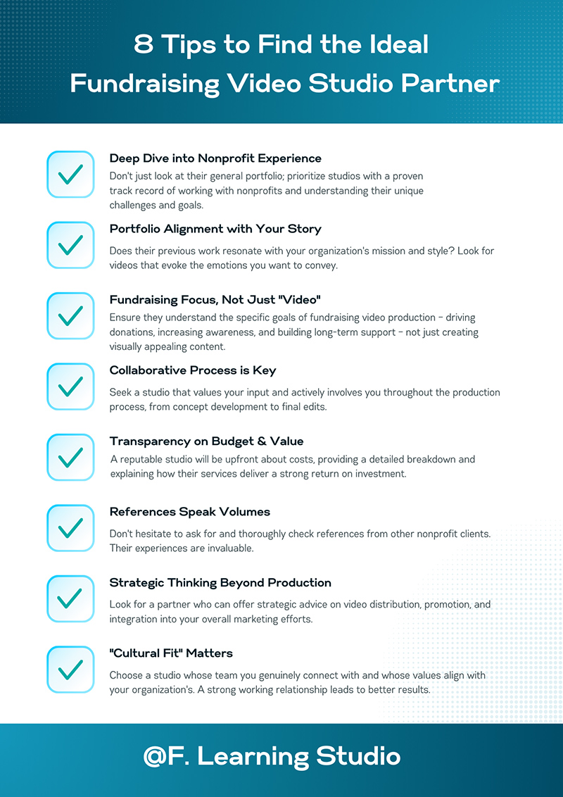 Partner with F.Learning Studio to create your fundraising video that captivates donors! Connect with our nonprofit video experts today for a free consultation. Let’s discuss your needs and create a plan to maximize your impact.