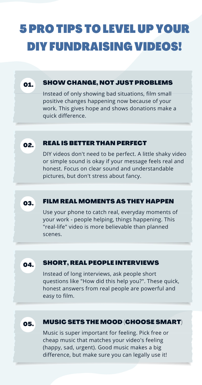 | 4 | Plan Visuals | → B-Roll Footage: Show your work, people helped, relevant visuals. → Interviews: Testimonials from beneficiaries/supporters (relatable). → Branding: Logo, website, social media links (start & end). |