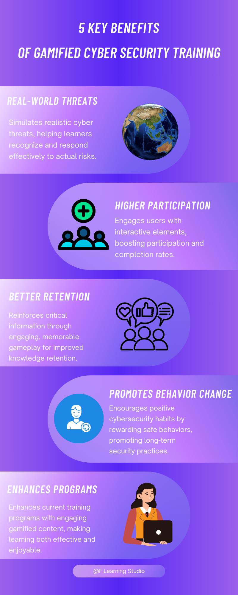 F.Learning Studio brings a wealth of experience in gamification, particularly in designing interactive elements tailored to the needs of corporate training. We specialize in adding engaging components, like scenario-based challenges, point systems, and instant feedback features that make cybersecurity training compelling and relatable.