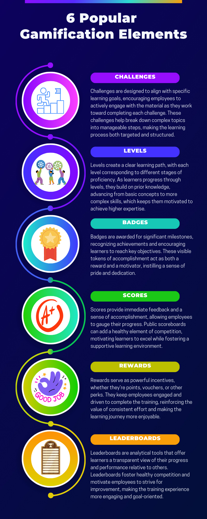 | 6 | Axonify | A microlearning platform with gamification elements to drive daily learning habits | Quizzes, rewards, personalized learning, AI-driven content | Retail and frontline employee training |