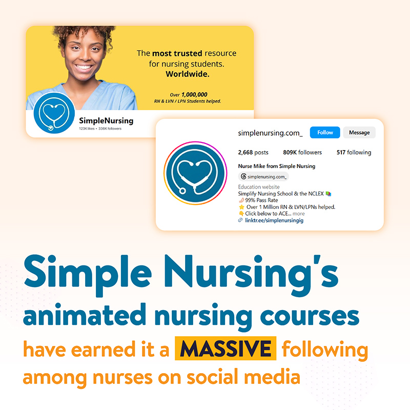 This video offers essential tips for nursing students to simplify pharmacology, covering memory aids and dosage calculations. Moreover, Simple Nursing – one of the Leading Nursing Educational Technology Companies in the US, has effectively used healthcare animation training through collaboration with F.Learning Studio, enhancing its brand image, attracting more learners, and gaining more than 500.000 followers on social media.