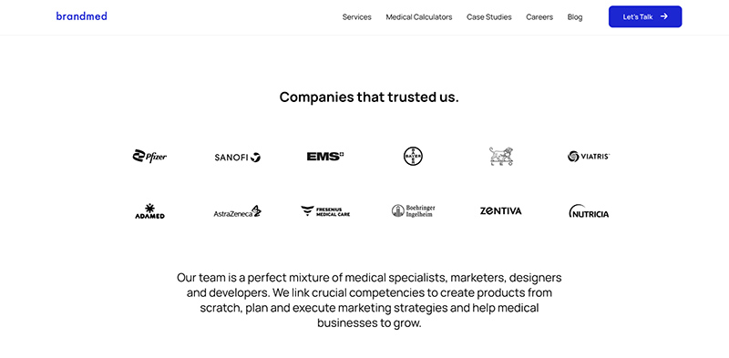 | 6. Brandmed | Digital solutions agency integrating medical expertise with technology, design, and marketing for healthcare businesses. | Medical graphic design, medical illustrations, medical photography. |