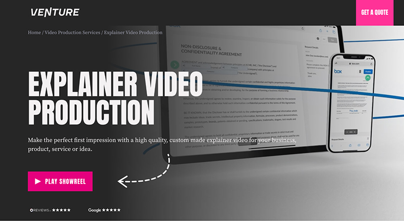 | Venture Videos | Product explainer videos, company explainer videos, video adverts | Software, finance, healthcare, education, retail |